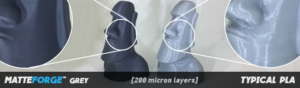 Dette innovative filament giver en finish der ikke kan sammenlignes med andre filamenter på markedet. MatteForge reducerer synligheden af lag og giver et professionelt udseende på alle dine print. Dette opnås, samtidig med kontrasten mellem lys og skygge forbedres så fine detaljer fremhæves. Denne yderst ønskelige effekt gør MatteForge perfekt til industriel og produktdesign og tekniske ingeniørmodeller.